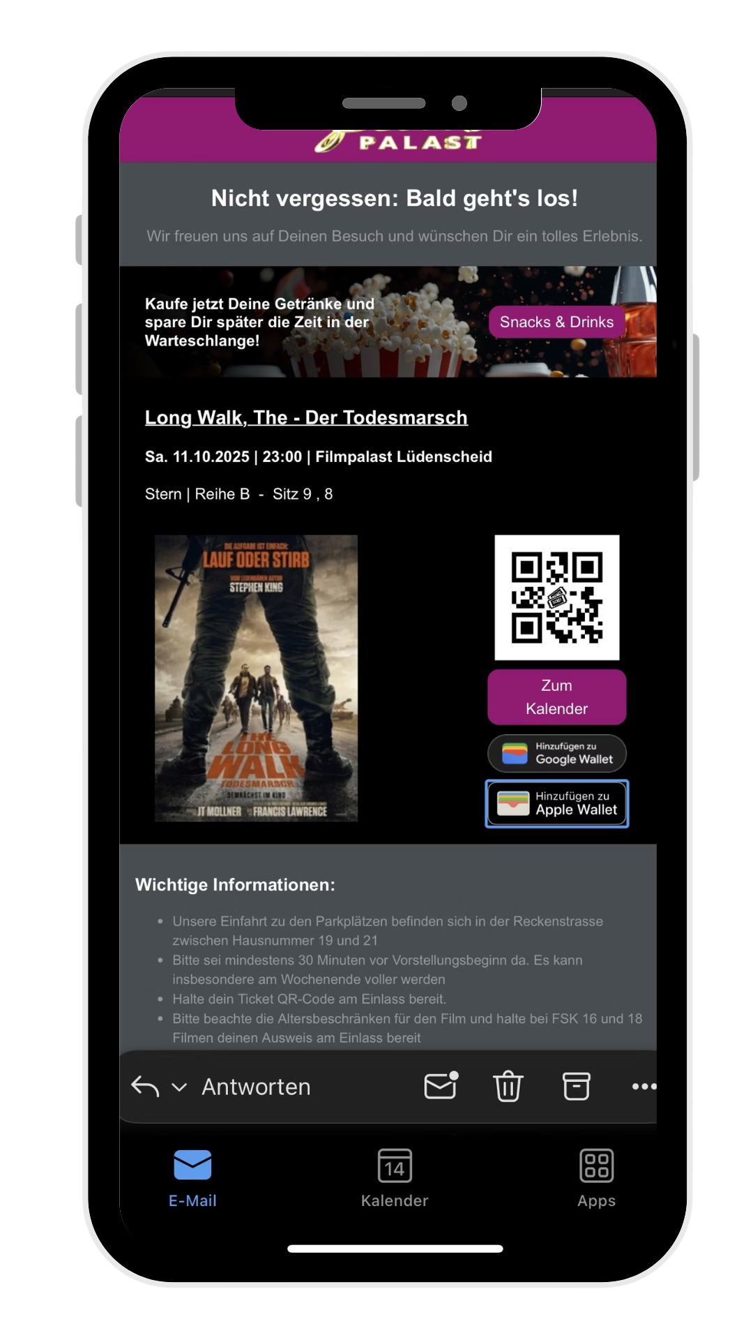 Jede Buchung löst eine Kette aus: Bestätigungsmail, Erinnerung vor dem Kinobesuch, Hinweise zur Anfahrt, Infos zur Concession Abholung. Mit automatisierter Kommunikation läuft das im Hintergrund. Der Gast bekommt zur richtigen Zeit die richtige Information. Wo finde ich mein Kino? Wo hole ich meine Bestellung ab? Was erwartet mich heute Abend? Das reduziert Rückfragen an der Kasse und sorgt dafür, dass Gäste vorbereitet ankommen.